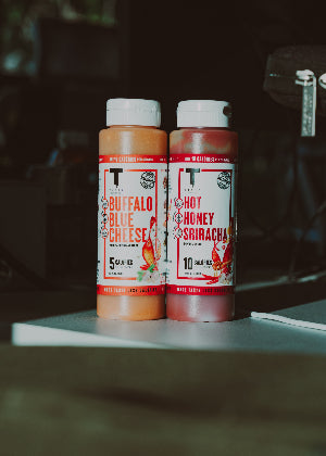 Spice is in the spoon of the beholder! We all have different spice tolerances but we estimate our Spicy Garlic Parm and Hot Honey Sriracha to be 6/10 and our Buffalo Blue Cheese to be 7/10. However, our Cherry Smoked BBQ and Sweet Honey Mustard are a 0/10!